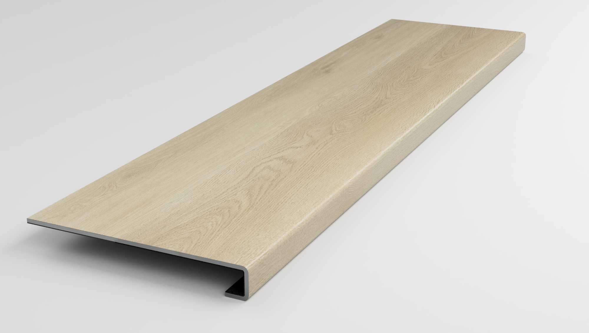 This variant is a Stair Nose made from a Mohawk Amber Escape Foley Luxury Vinyl Plank. It is designed to be fitted and glued to the unfinished Stair Tread Nose. An addition Mohawk Amber Escape Foley plank that you supply can be clicked in behind the nose to cover the remaining unfinished area.